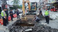Sat Lantas Polres Pematangsiantar Kawal Perbaikan Jalan Amblas di Jalan Gereja