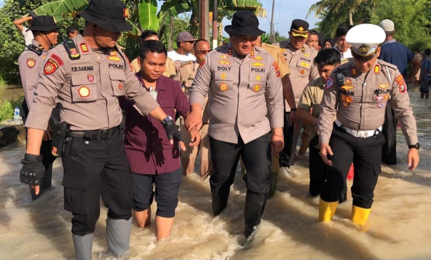 GARUDANEWS.co, BATU BARA – Kapolres Batu Bara AKBP Doly Nelson H. H. Nainggolan, SH, MH bersama jajaran Pejabat Utama (PJU) Polres Batu Bara dan Bupati Batu Bara H. Baharuddin Siagian, SH, M.Si melakukan peninjauan ke wilayah yang terdampak banjir di Desa Nenas Siam, Kecamatan Medang Deras, Kabupaten Batu Bara, Senin (13/10/2025) sekitar pukul 13.30 WIB.