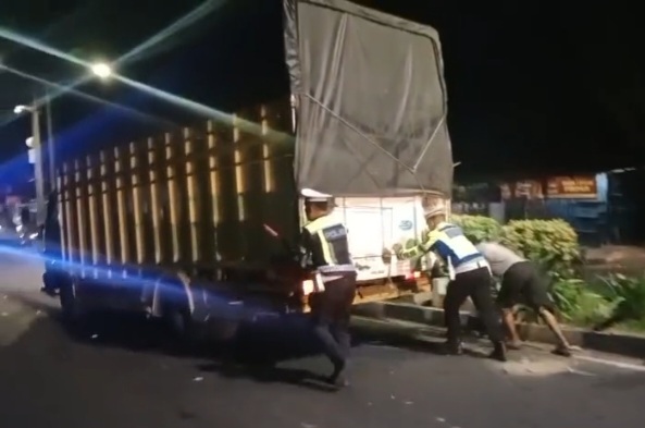 Dua petugas Satuan Lalu Lintas Polres Pematang Siantar terlihat bahu-membahu mendorong truk ke pinggir jalan demi membuka jalur yang sempat tersendat.